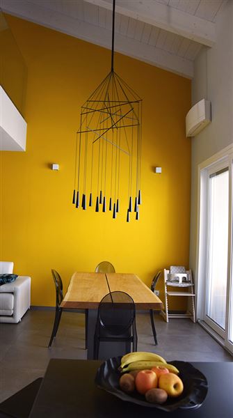 Il soppalco dà anche la possibilità di ammirare più da vicino le splendide lampade che Luca e Sarah hanno scelto per il living e la cucina. La loro finitura scura e la loro particolare forma apparentemente disordinata e instabile, dona all’ambiente un tocco sofisticato ma decisamente moderno e affascinante!