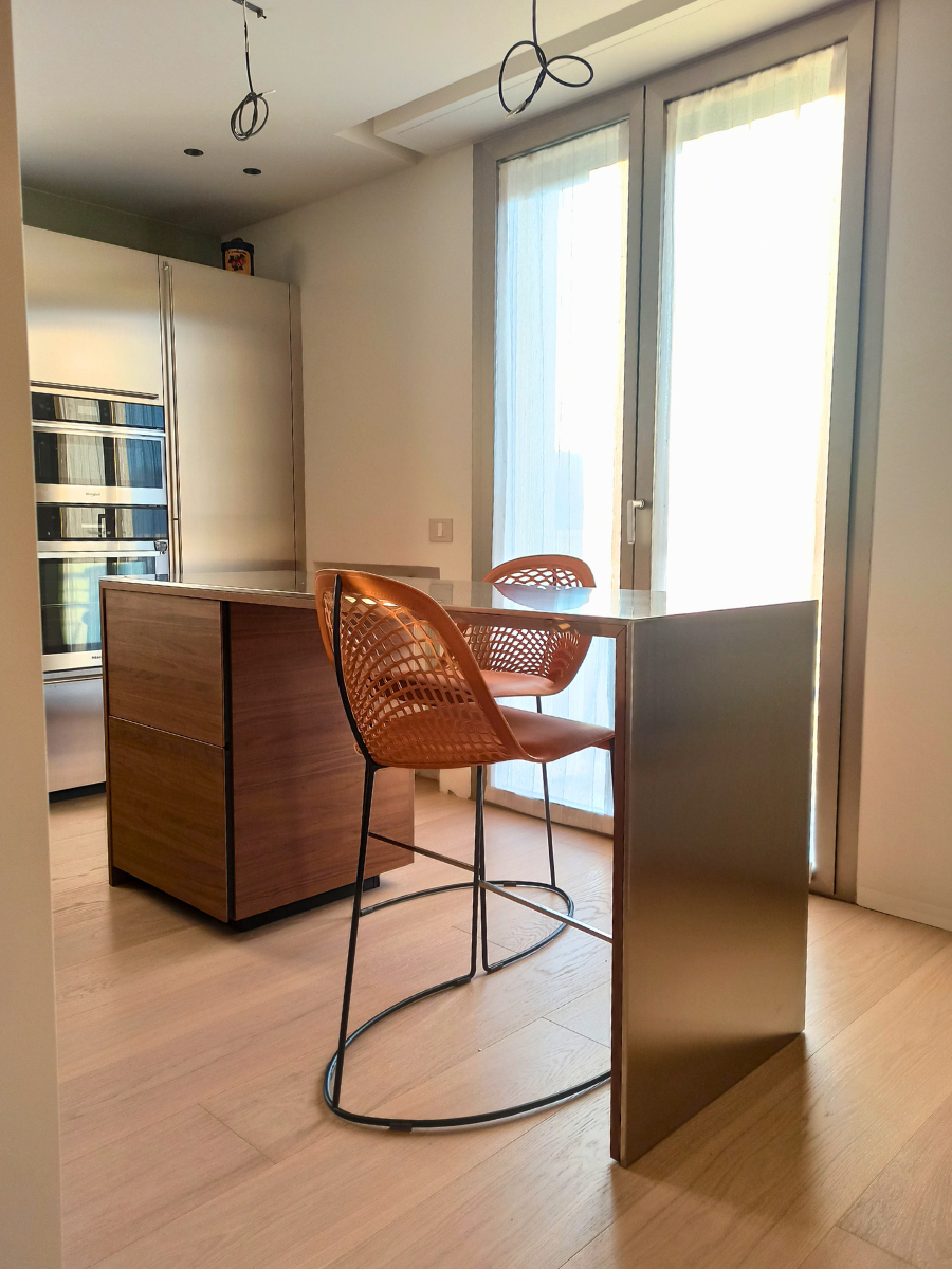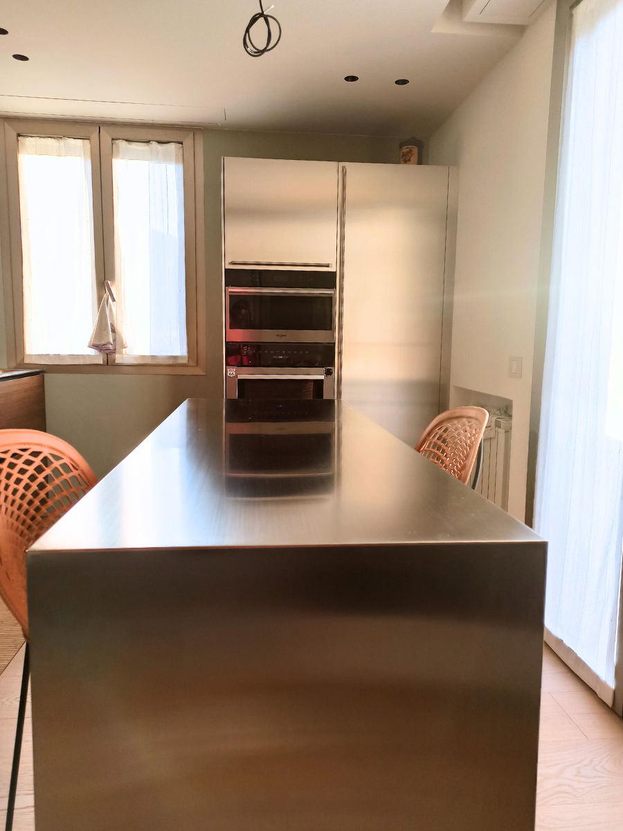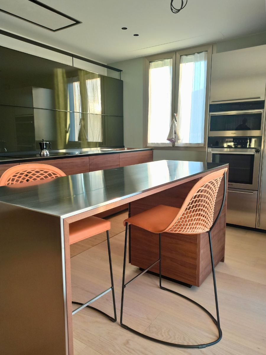 L’acciaio è un elemento di forte carattere che rende l’ambiente tecnico ed elegante allo stesso tempo. Abbiamo saldato i vari elementi in acciaio, garantendo superfici continue e senza interruzioni.