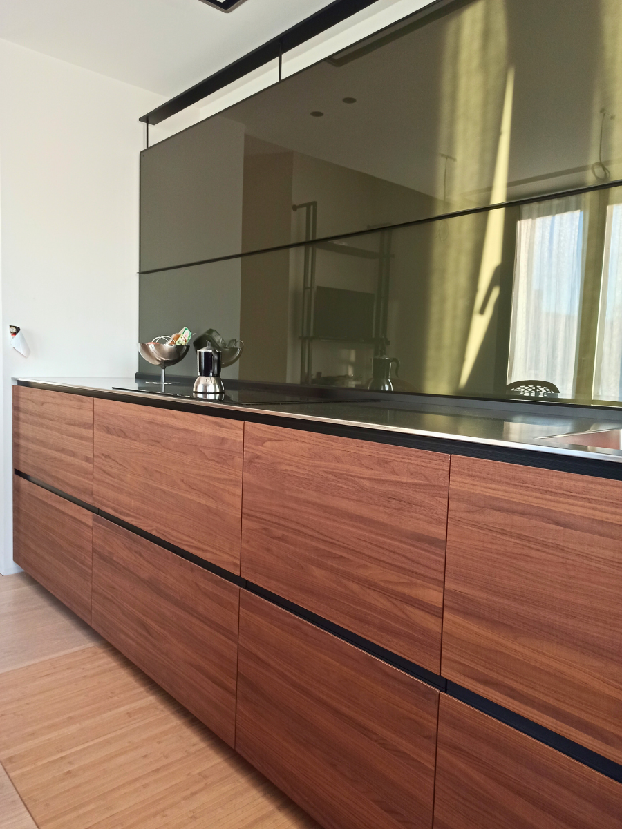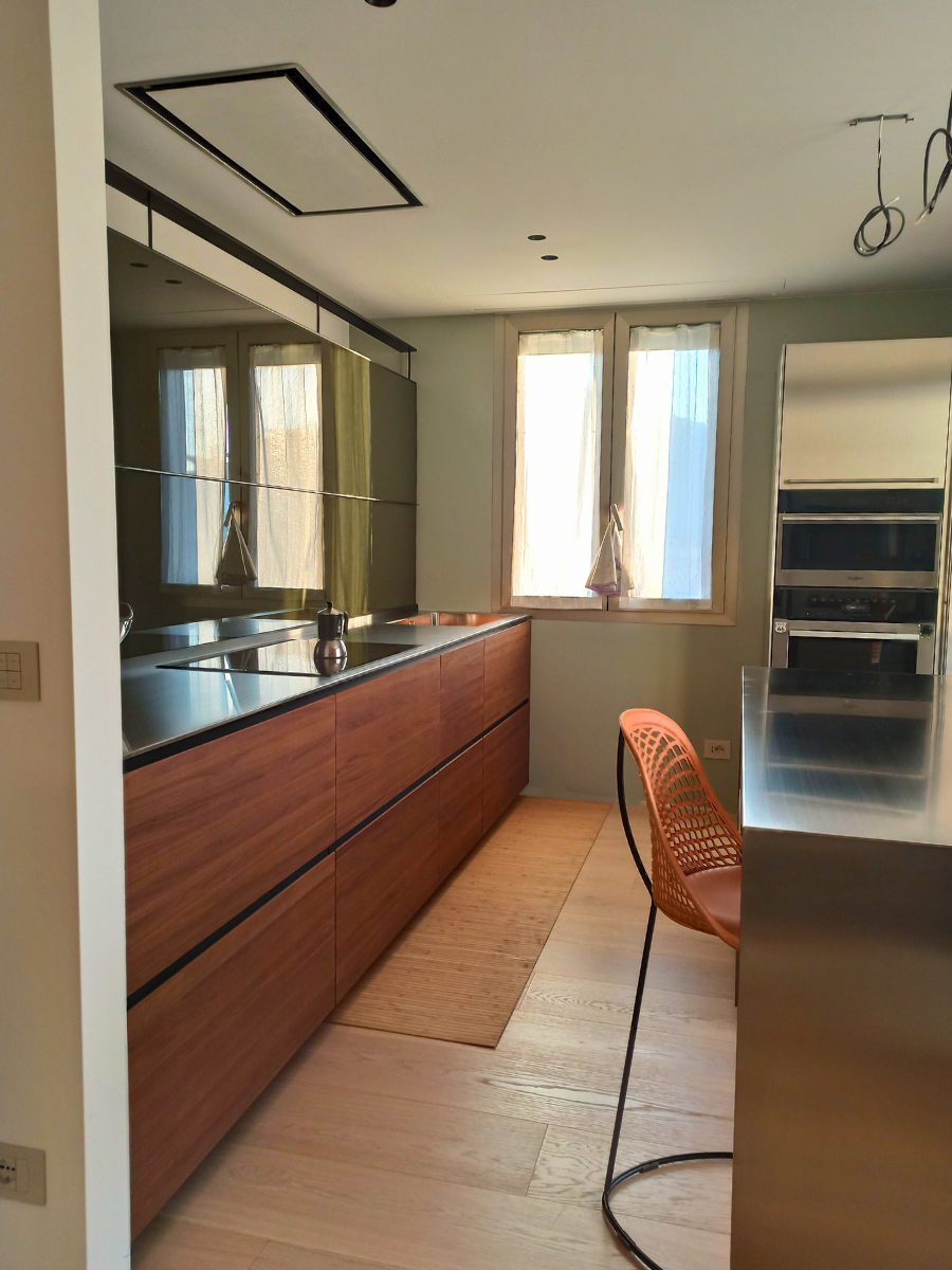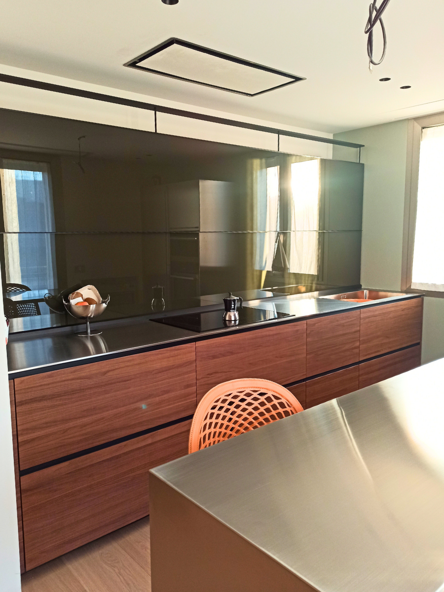 L’acciaio è un elemento di forte carattere che rende l’ambiente tecnico ed elegante allo stesso tempo. Abbiamo saldato i vari elementi in acciaio, garantendo superfici continue e senza interruzioni.