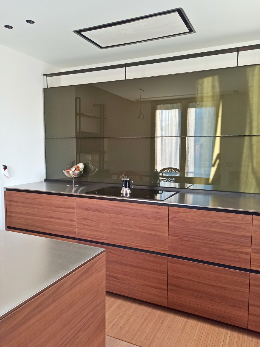 Dietro una parete di vetro verde si nasconde un vano attrezzato che permette di cucinare con tutto il necessario a portata di mano ma che può scomparire per tenere fuori dalla vista gli elementi di servizio che non ci piace fare vedere agli ospiti.