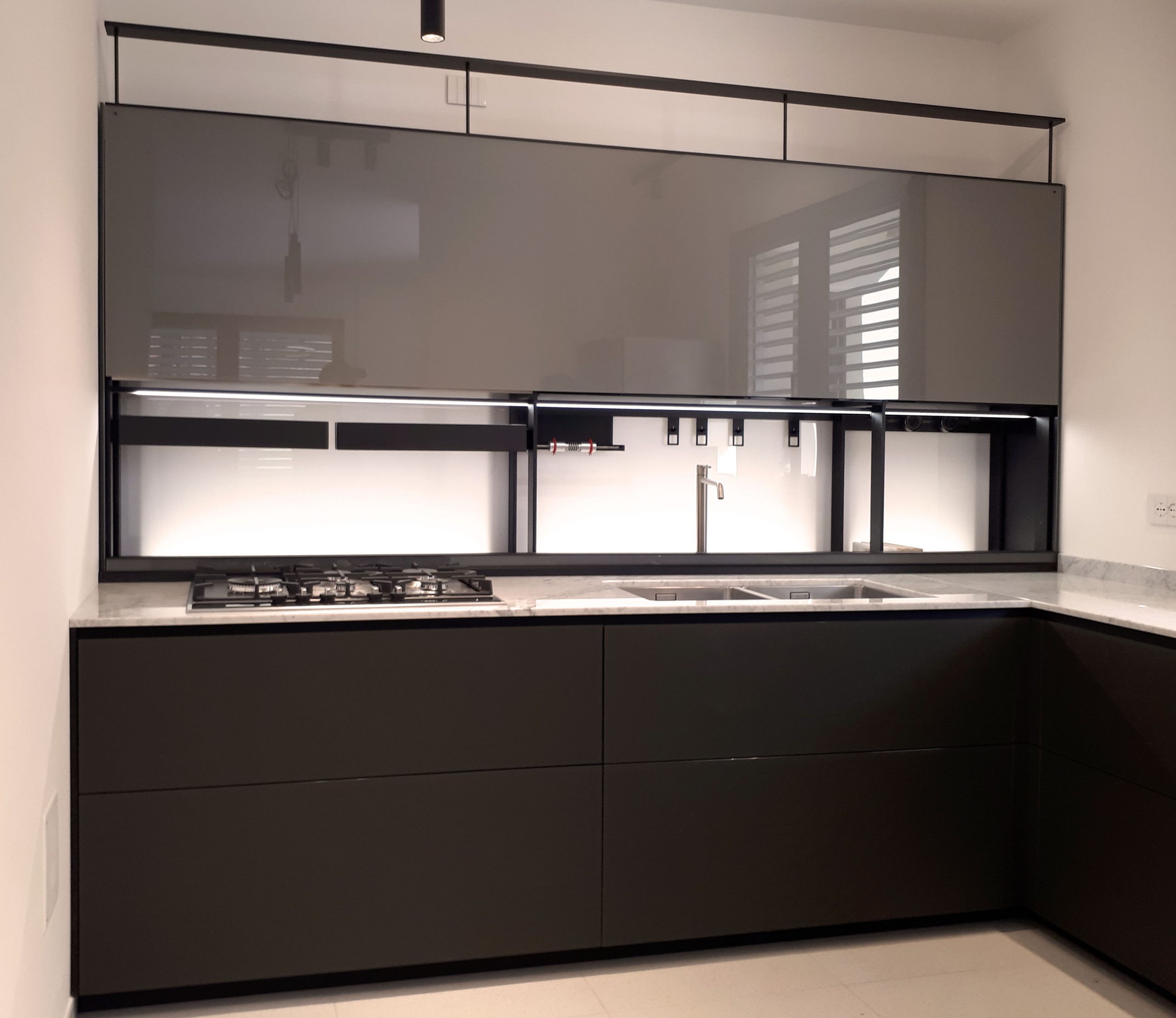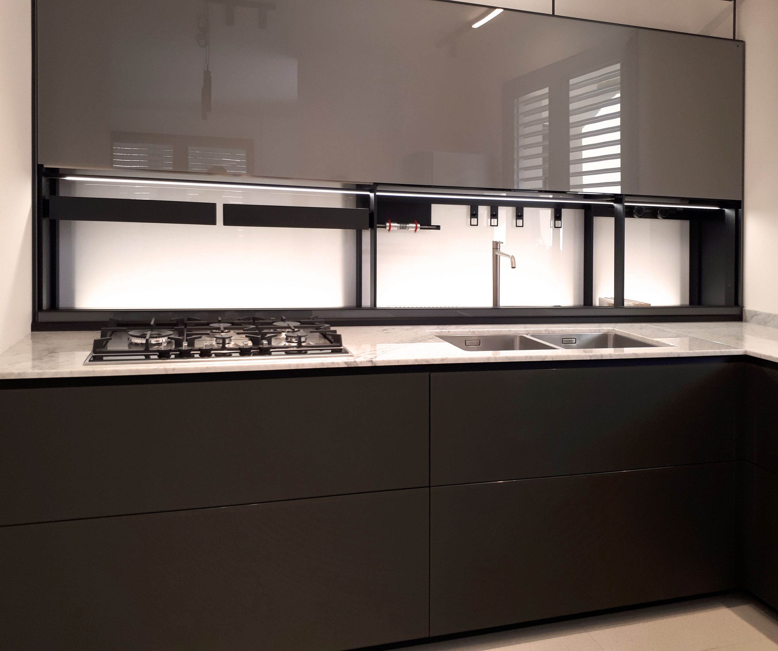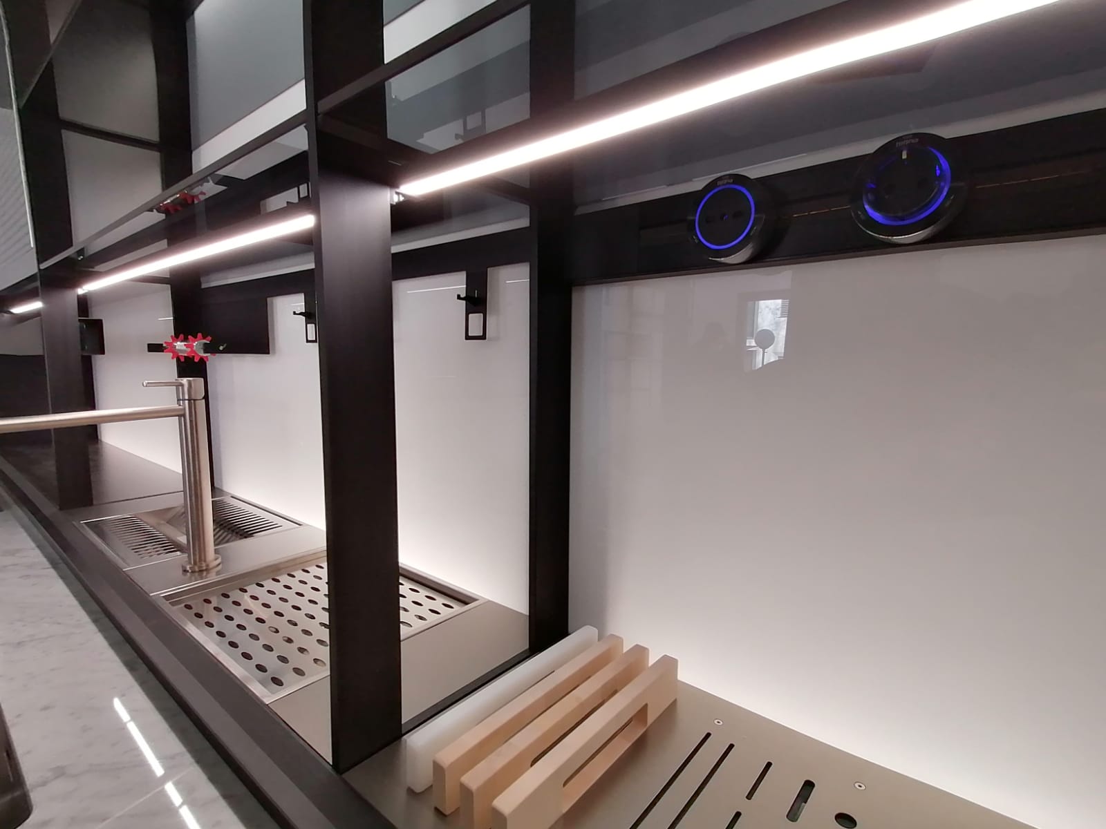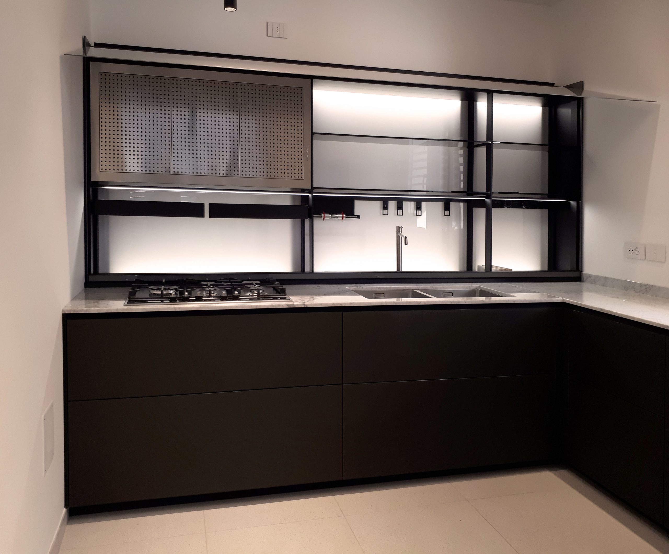 Questo sistema è uno spazio attrezzabile con tanti accessori diversi e può essere chiuso per lasciare la cucina ordinata alla vista. E’ realizzato in alluminio e vetro temperato.