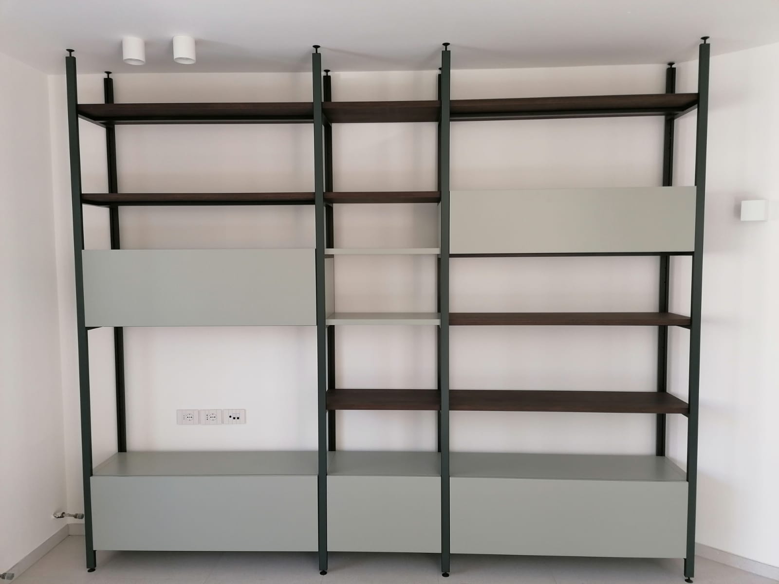 Nella zona giorno abbiamo progettato il “Pontile”, struttura di Novamobili pavimento-soffitto, in cui elementi aperti e chiusi si alternano.