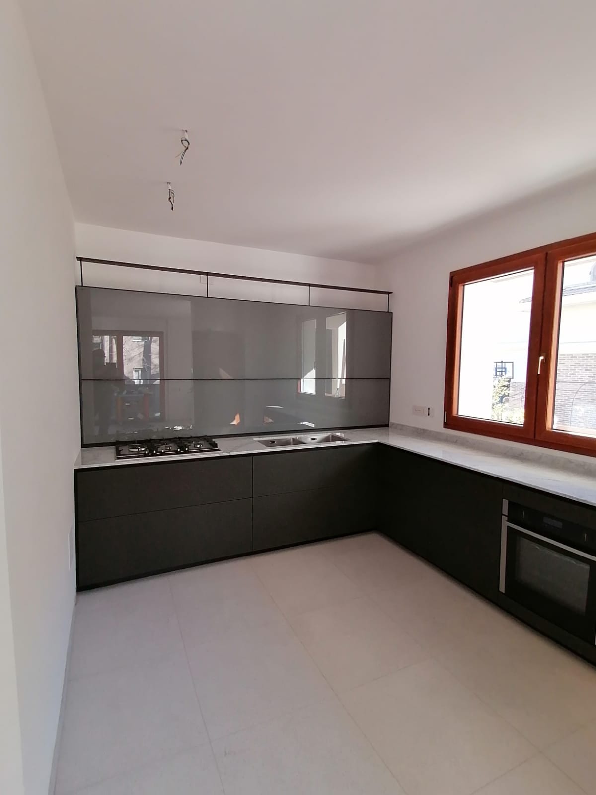Le ante sono in vetro opaco laccato verde scuro, abbinato a un piano di lavoro in marmo di Carrara naturale.