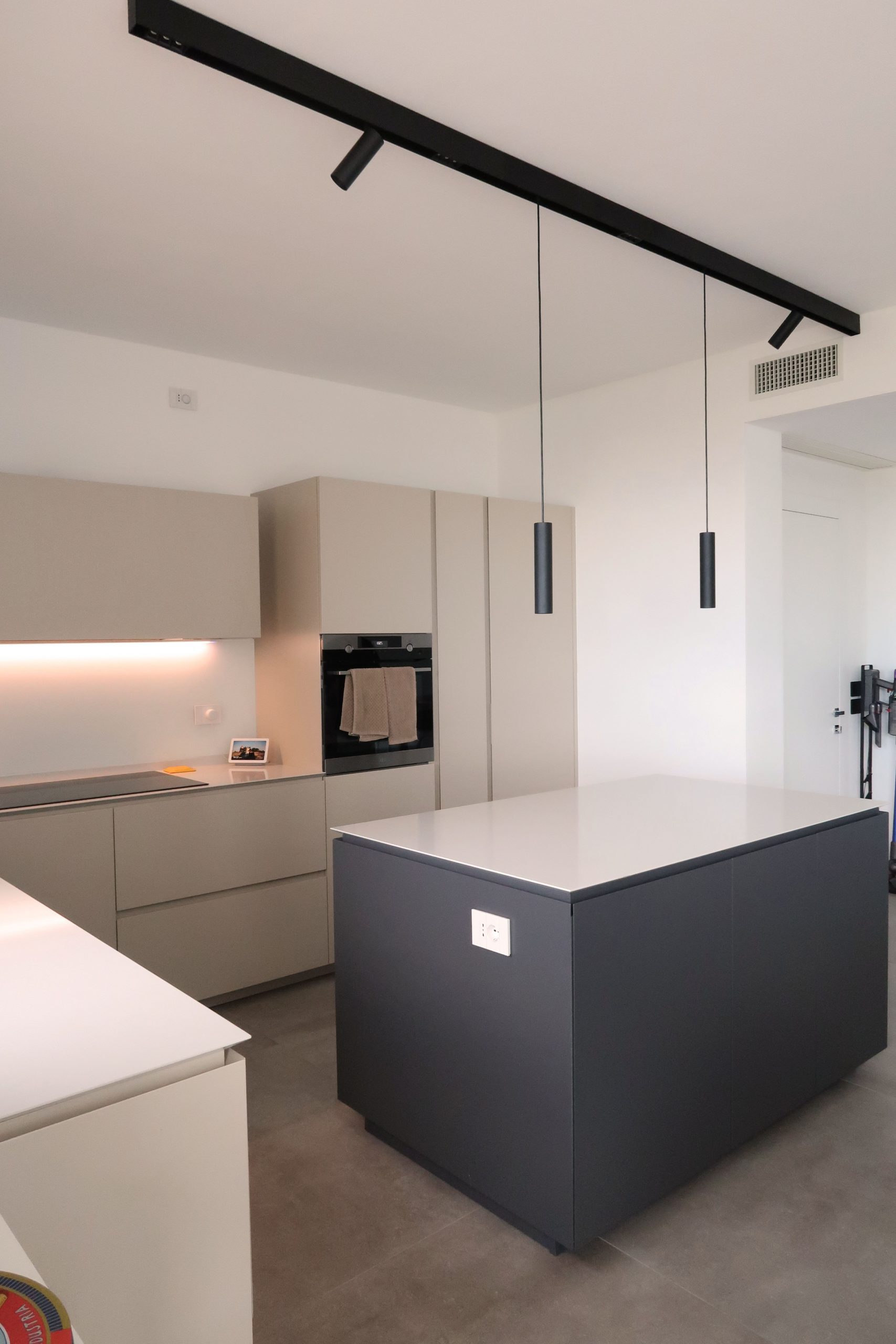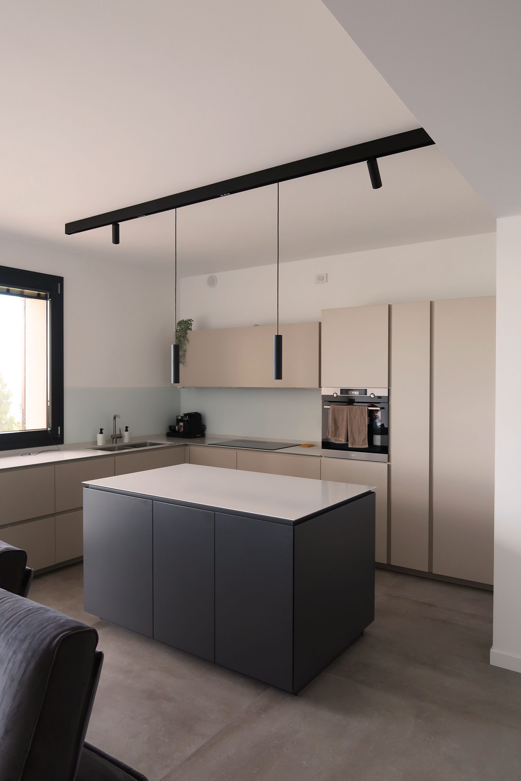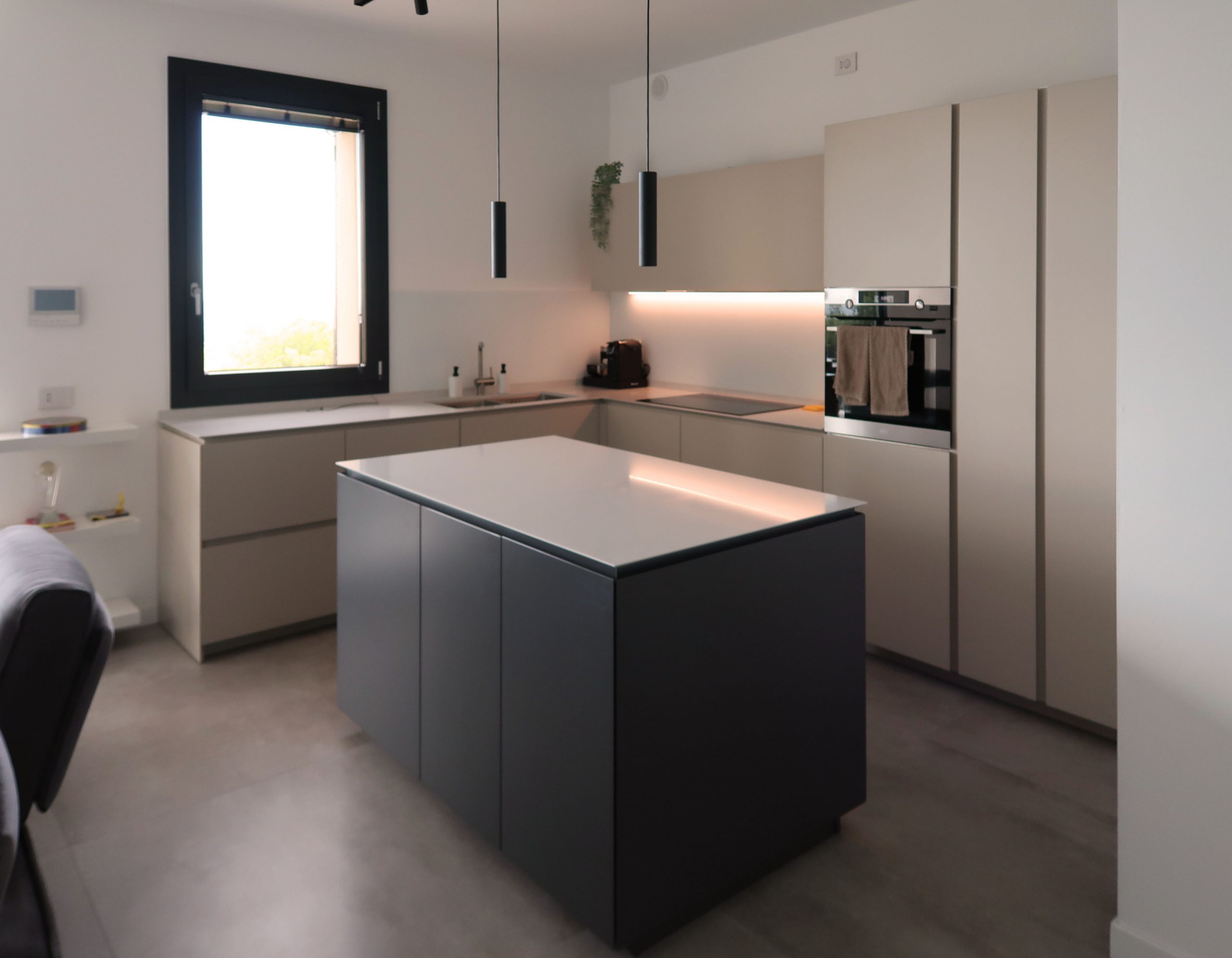 Insieme ai clienti abbiamo scelto una finitura laccata opaco in due colori, un cachemire delicato abbinato ad un grigio ghisa più deciso, in armonia con i colori scelti nel resto della casa.