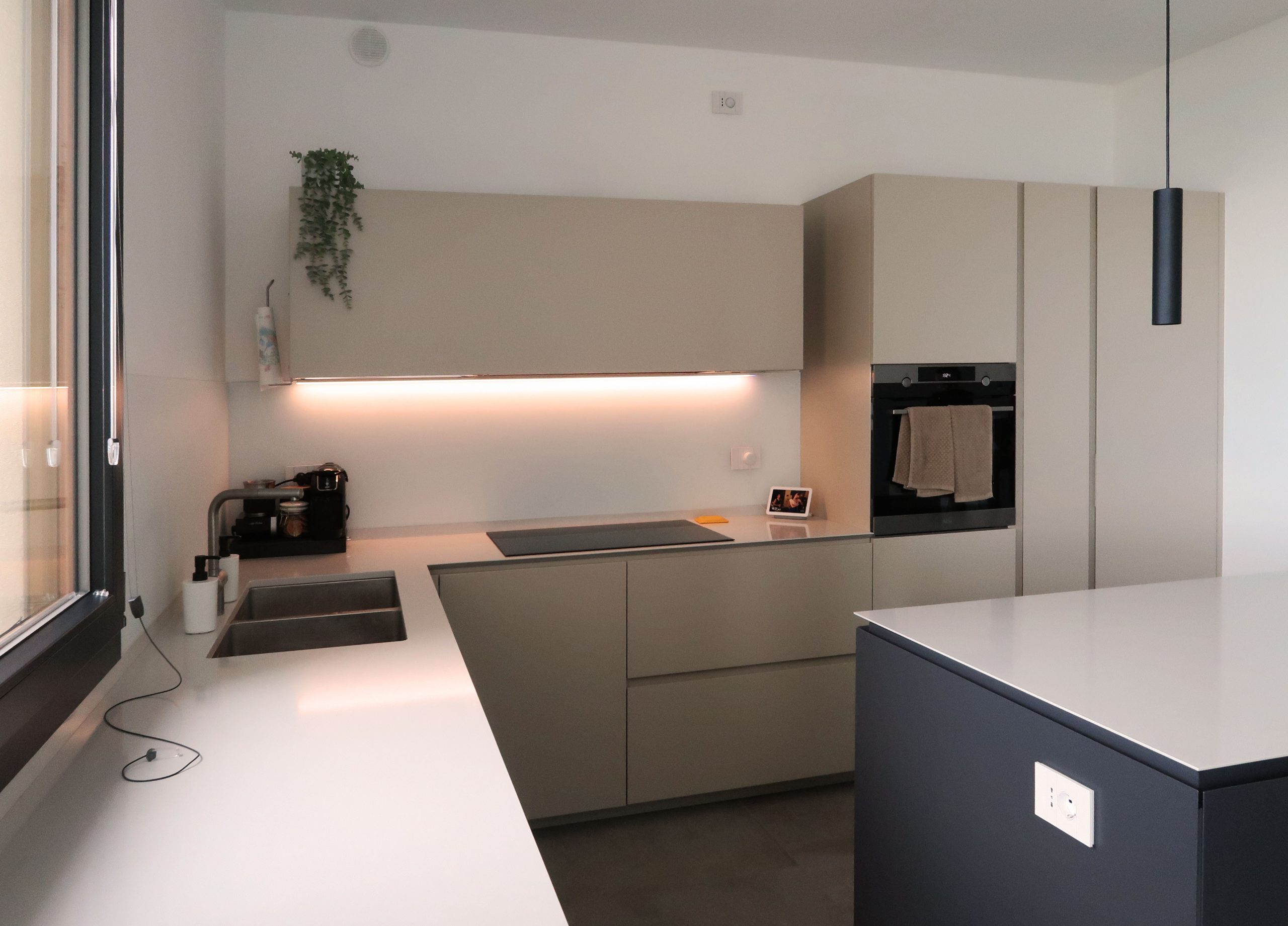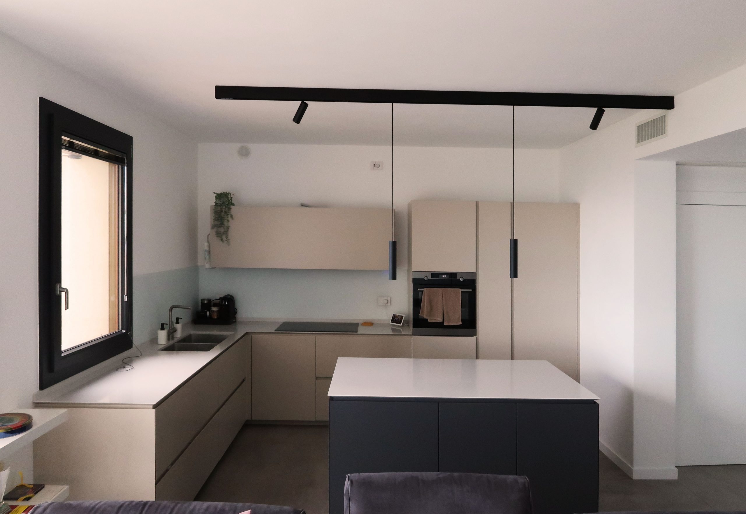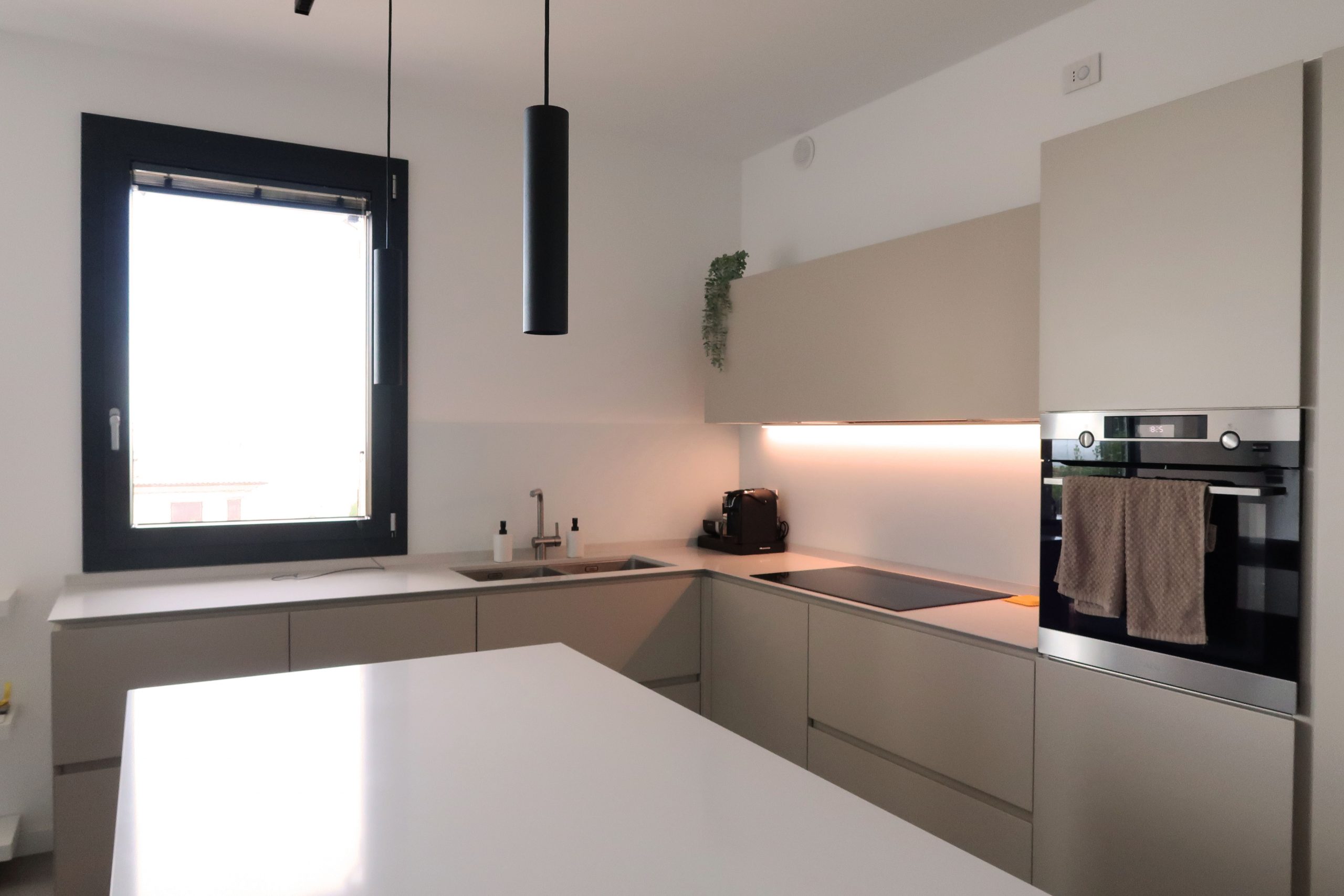 Insieme ai clienti abbiamo scelto una finitura laccata opaco in due colori, un cachemire delicato abbinato ad un grigio ghisa più deciso, in armonia con i colori scelti nel resto della casa.