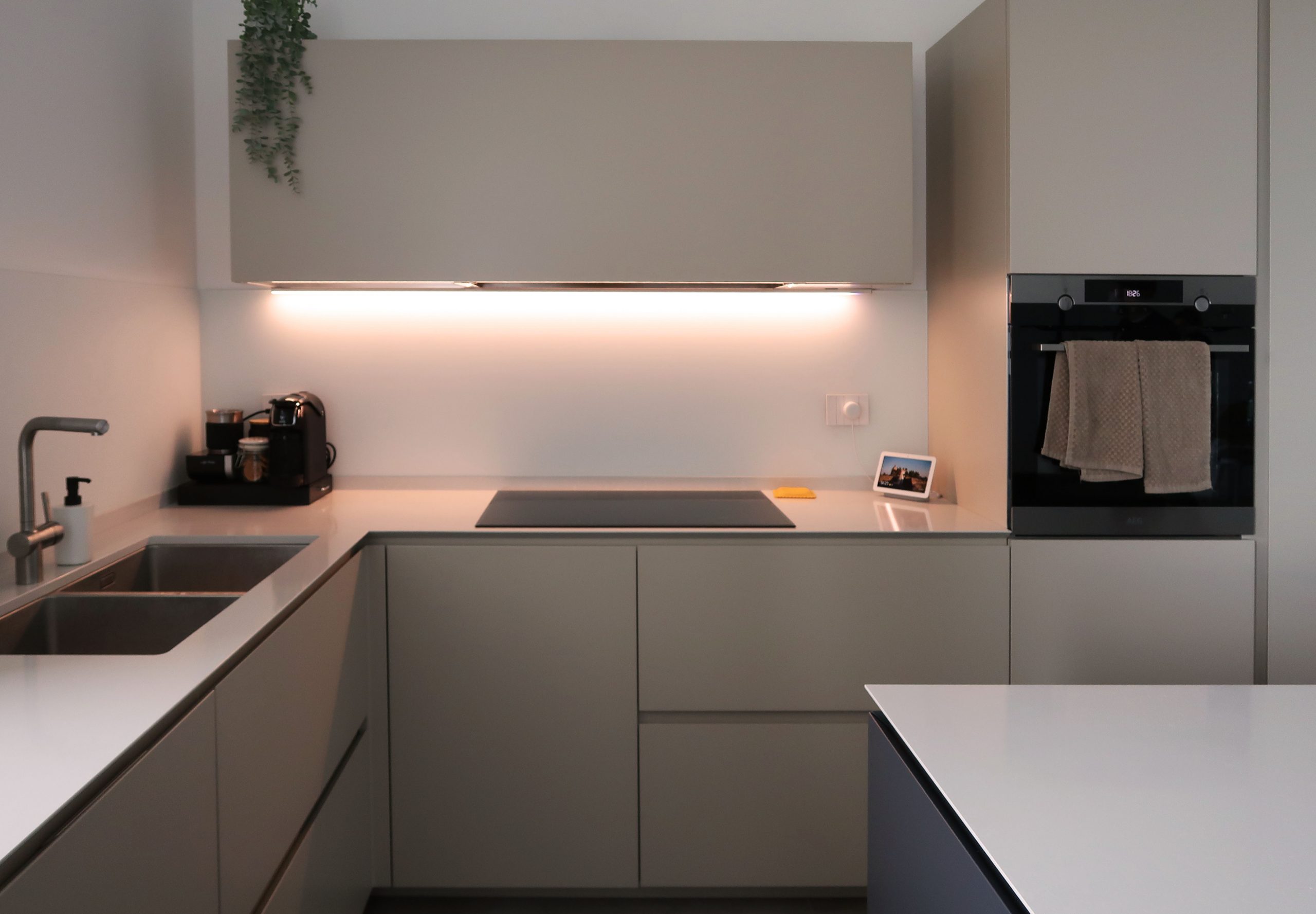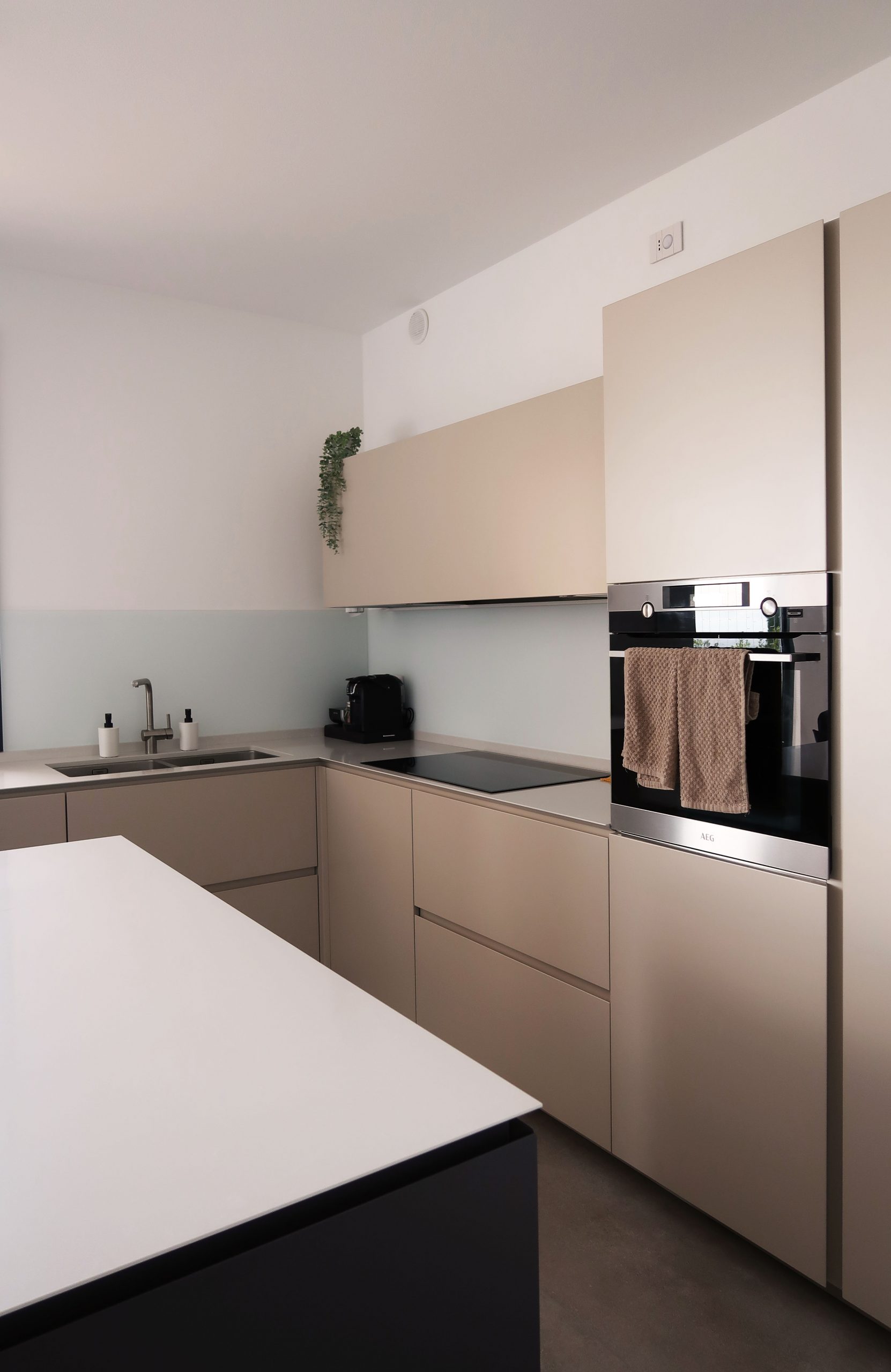 Per il piano di lavoro, abbiamo scelto un quarzo chiaro leggermente venato. Dietro al piano cottura e lavello abbiamo scelto di aggiungere un paraschizzi Magnetolab, in vetro opaco bianco.