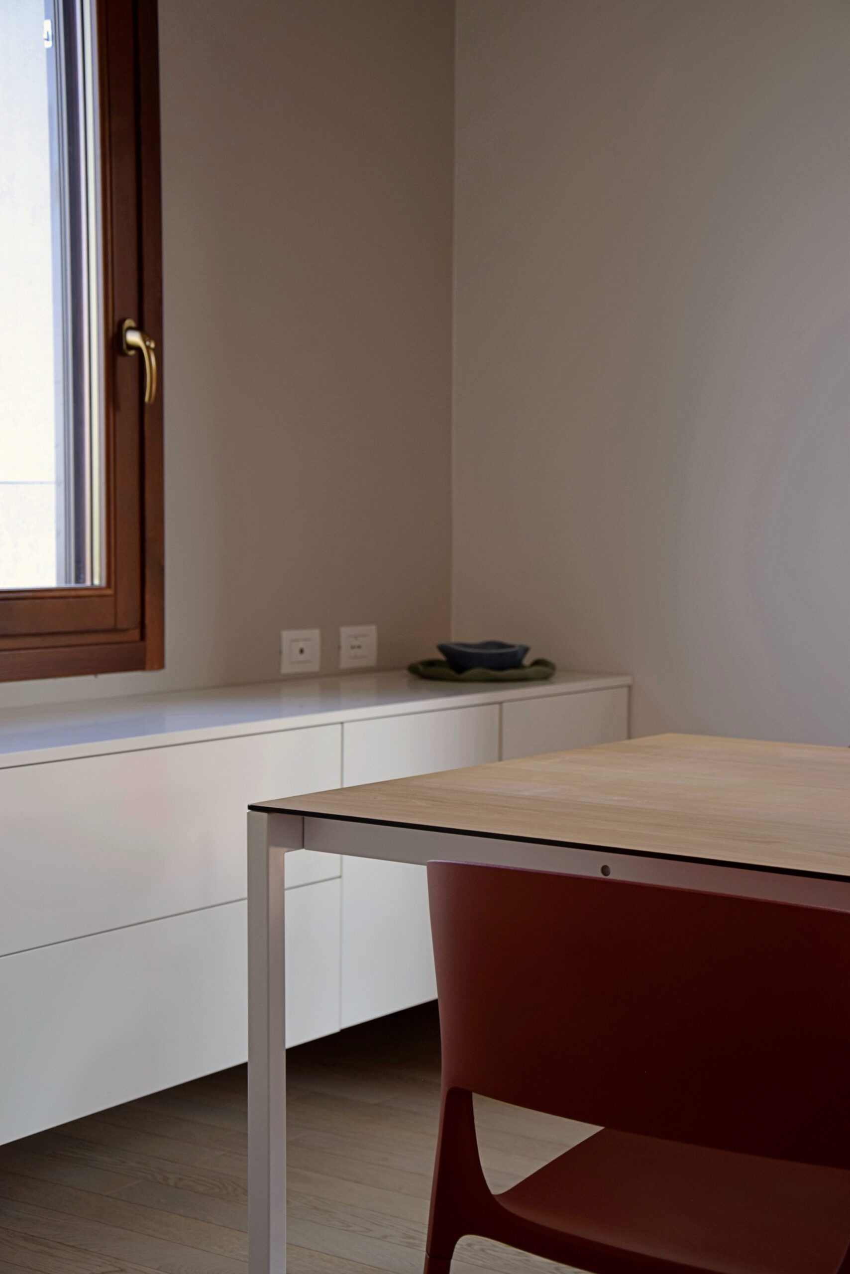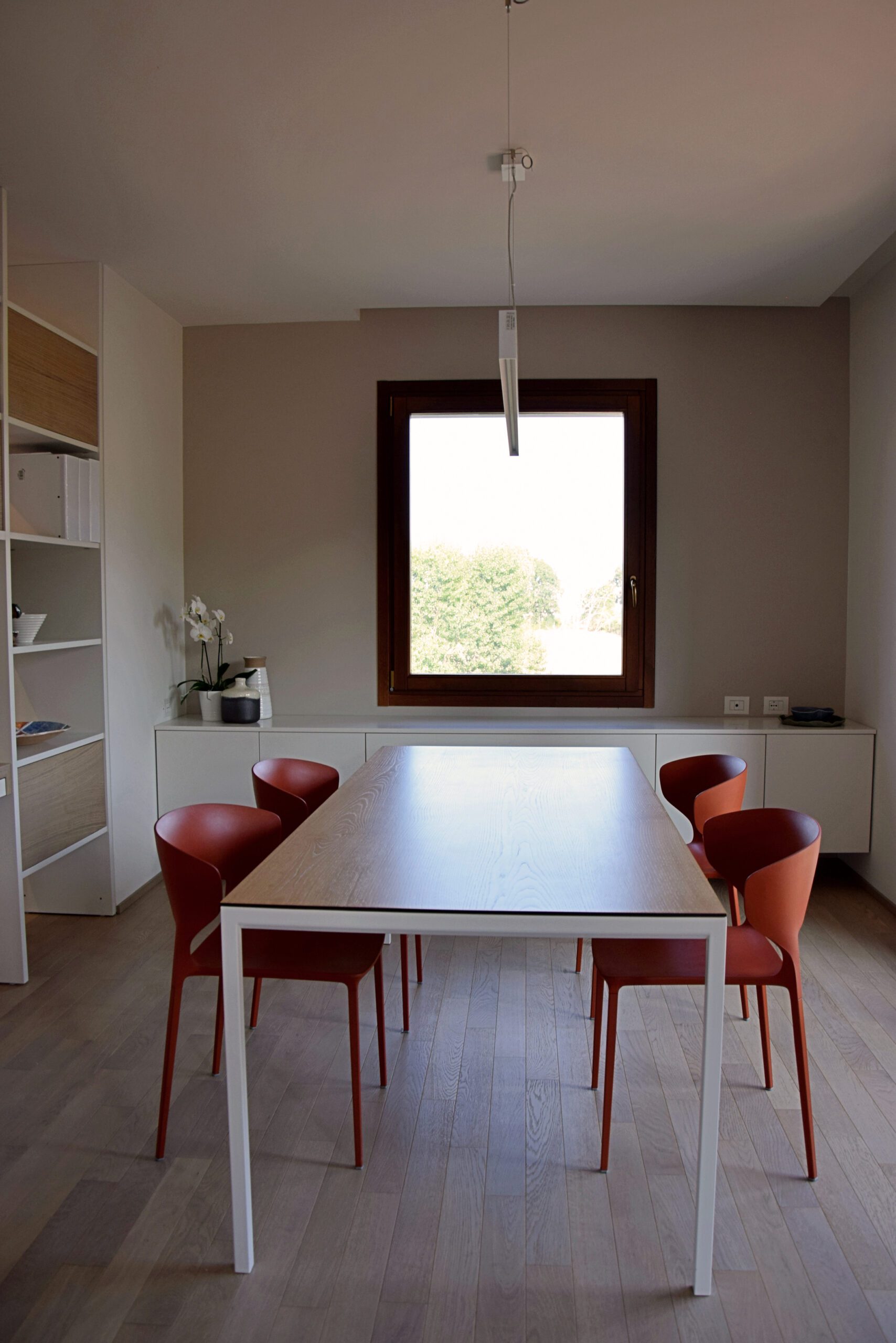 I colori sono tenui e rilassanti, in cui le tinte legno del pavimento e degli arredi comunicano tra loro. Solo per alcuni elementi, come le sedute, si è scelto un colore d’accento Ruggine.